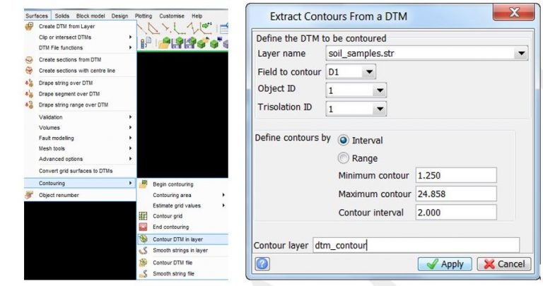 6. Select Surfaces > Contouring > Contour DTM in layer. Note that if your dataset is big, it is recommended to use the file-based method (Surfaces > Contouring > Contour DTM file), rather than the graphics-based method.