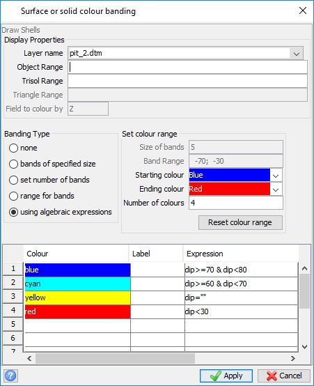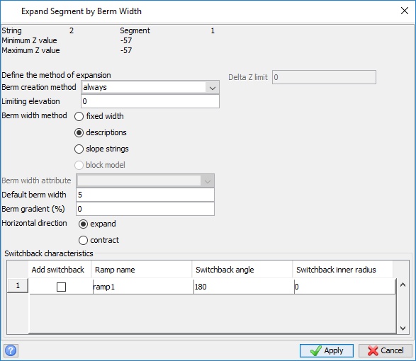 Now to expand the pit further with berm width, go to Design > Expand segment > By berm width and select Berm width method as “descriptions”; then go to Design > Pit design > Display berm width: