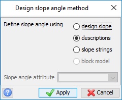 To start the pit design, first go to Design > Pit design > Select slope method and select “descriptions” as Design slope angle method: