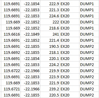 The csv currently looks like the image below, with Longitude in column 1, Latitude in column 2 and height in column 3. The other fields will be carried through to the resulting string file but aren’t important for the conversion.