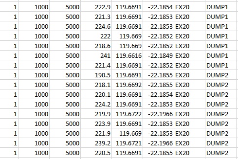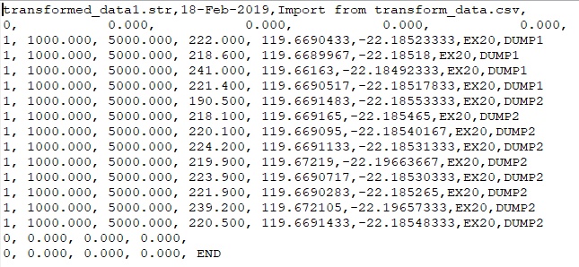You can now see that string number is in column 1, Y is in column 2, X is in column 3, Height in column 4 and so on. Having it in this format allows us to import it into Surpac as a string file.