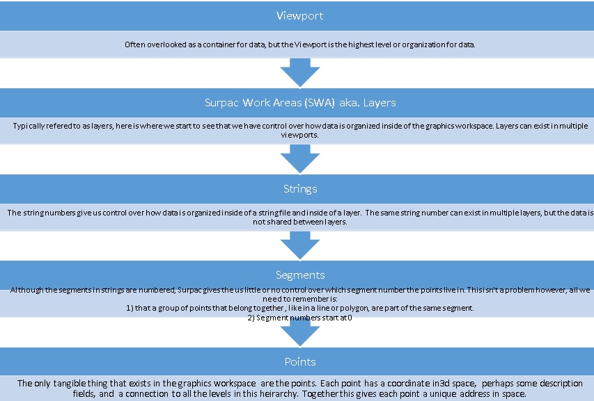 So, for a point to exist in the graphics workspace, it needs to have its complete address in the data hierarchy including Segment, String, Layer and Viewport. Let’s look at some the SCL commands we will need to know. Notice how the first 5 commands are related to the data hierarchy we just saw.