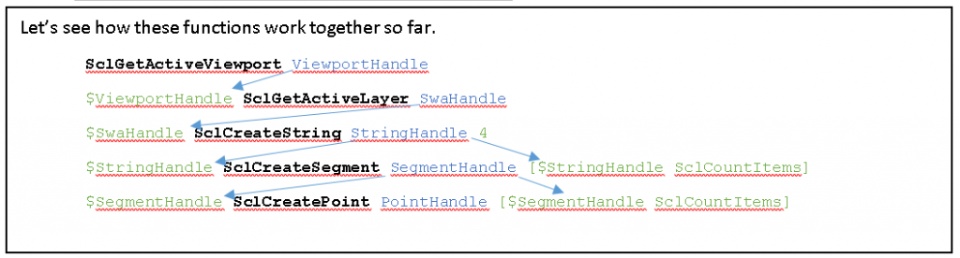 This function needs the name of the viewport for its query so we will pass it the name of the viewport using the variable name we made in SclGetActiveViewport. It will make another new variable for us, this time called “SwaHandle”