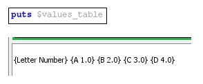 An easy way to retrieve individual values is to use the lindex command embedded in itself to specify the location row and column positions inside of the table, keeping in mind that lists start counting the first value at 0.