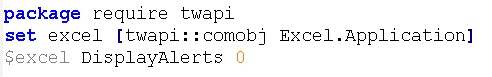 I need to prepare the macro to connect with Excel. Here the TCL command package require is used to ensure the interpreter is prepared with the appropriate package, twapi. I will also use a twapi command, comobj, to create a COM instance which will connect the macro to Excel.