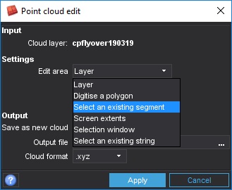 - Use Surfaces -> Mesh Tools -> Point cloud edit to clip the point cloud by an existing boundary if you have one. Otherwise select the option to “digitize a polygon”