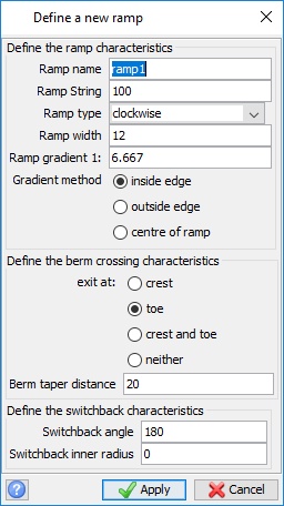 To start designing the pit, first go to Design > Pit Design > New Ramp; then select the ramp starting points and define the ramp properties as shown below: