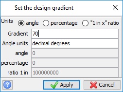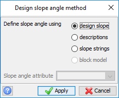 Next to define Design Slope Angle Method, go to Design > Pit Design > Select Slope Method and choose design slope. Then go to Design > Pit Design > Set Slope Gradient for entering bench slope gradient manually as shown below: