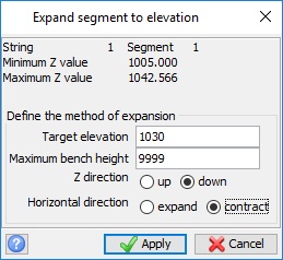 To design the next bench at 1030 mRL, go to Design > Expand Segment > To elevation; and select the pit top string file, it will create bench line at 1030 mRL where RL values are more than 1030.