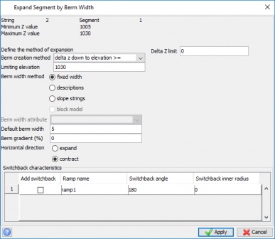 Now to expand the pit further with berm with, go to Design > Expand Segment > By berm width and select Berm creation method as “delta z down to elevation >=” and set Limiting elevation as “1030”: