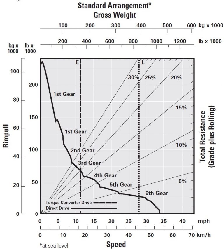 - From the loaded truck weight-total resistance interception, draw a horizontal line to intercept the highest gear illustrated in blue,